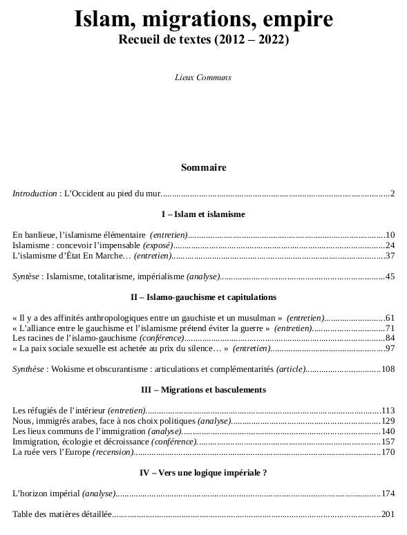 Sommaire Introduction : L’Occident au pied du mur (analyse) I – Islam et islamisme En banlieue, l’islamisme élémentaire (entretien) Islamisme : concevoir l’impensable (exposé) L’islamisme d’État En Marche… (entretien) Syntèse : Islamisme, totalitarisme, impérialisme (analyse) II – (…)