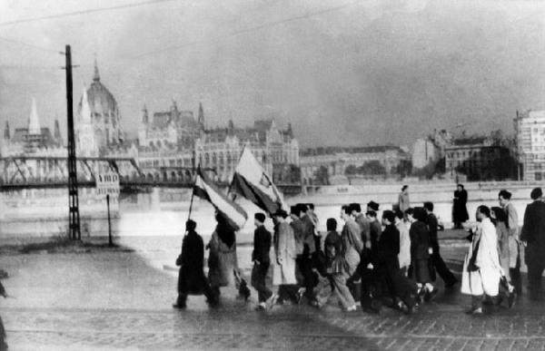 La manifestation fut bientôt en route. De plusieurs quartiers de Budapest, les cortèges convergeaient vers la statue de Bem. Une foule de plusieurs milliers de personnes s’était rassemblée sous la statue de Petöfi et rejoignait maintenant la manifestation. Les couleurs nationales hongroises – rouge-blanc-vert – apparaissaient très en évidence. Des pancartes et des calicots improvisés firent également leur apparition ; certains portaient simplement le mot « Liberté », d’autres ajoutaient « Indépendance -Vérité », d’autres encore faisaient appel à l’« Amitié entre la Pologne et la Hongrie ». Parmi les slogans aussi nombreux que divers, qui témoignaient chacun à leur façon de la personnalité des manifestants, aucun n’était expressément anti-russe ; un seul s’en approchait : « Que chaque nation garde son armée sur son territoire ! » [19].